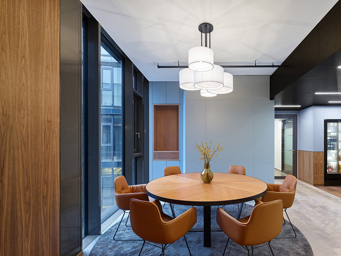 一进入接待区,就能感知所在地域对室内空间设计的影响,黑色木条天花造型和红木构筑的装饰墙面,城市形象与室内的互动体现在各种区域性材料和横跨整个办公空间的精细图形设计中。会议室的天花板采用城市图形设计,并以此为会议室命名;此外还将当地著名的思想家引入到设计中。#办公空间设计#