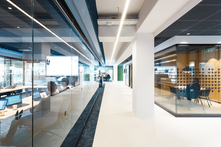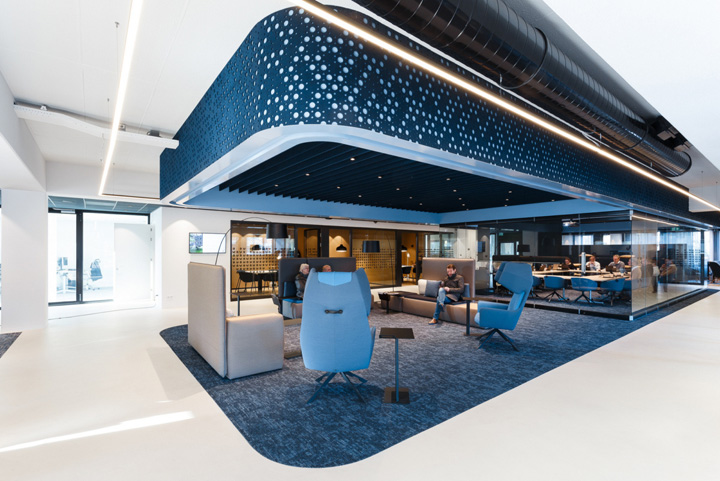 可持续发展理念在本案得到完美体现,采用的许多新材料都是回收再利用材质。比如由深蓝色纤维毛毡包覆的漂亮墙面和吸音挡板吊顶,它们都来自塑料饮料瓶的回收再生产。而且,未来还可以再被回收利用。#总部办公楼设计装修#