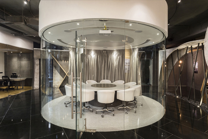 围绕着圆形会议室的周边是一些极为有趣的曲面空间构造,采用特殊的施工工艺,呈现出丰富奇特的空间效果。所有这些装置和元素都统一在暗调的镜面般黑色花岗石地面中。#办公室装修效果#