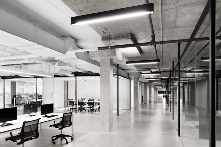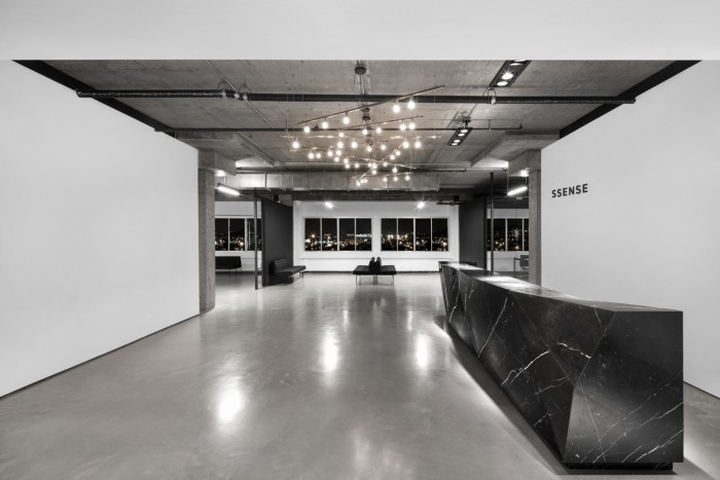 设计灵感源于企业时尚而极致简约的图形签名,打造出一个奢华而极简的黑白空间。老建筑未经修饰的天花板、墙壁、原始的结构柱、甚至那已锈迹斑驳的管道都被完整的保留,这些陈旧的迹象如同一幅自然的生活画面,衬托着新的建筑空间。该项目的设计精神意在追寻过去与未来的联系,这一概念通过新的建筑元素与老建筑构造巧妙的连接、以及微妙的细部处理而被深深植入到空间中,这种精神赋予了空间以情感。#办公室设计装修#