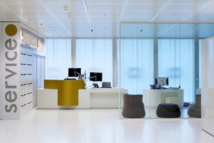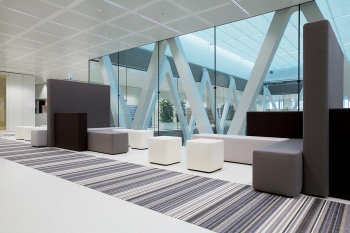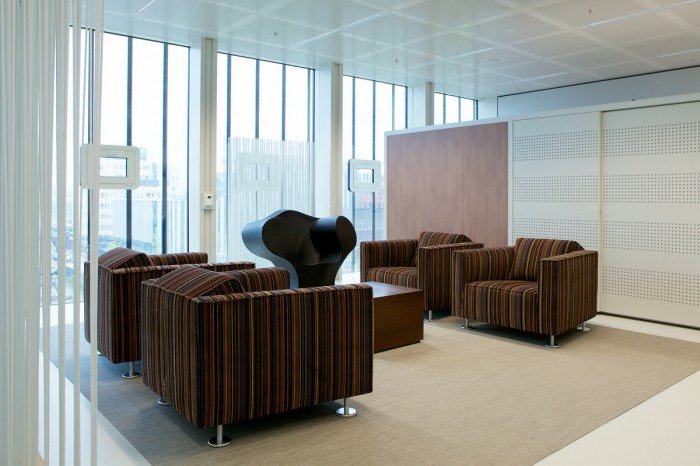 为了营造通透的空间视野,必须的封闭空间被安放在不被注意的角落。在这幢四层楼的建筑内,一楼主要用于会议、礼堂以及多功能厅等公共空间,其它三个楼面则都用于办公。会议室有多种大小与风格可供选择,多功能厅可以迅速转换家具以适应各种不同需求。纯净而灵动的办公空间为员工营造了舒适而轻松的工作氛围。#办公室装修案例#