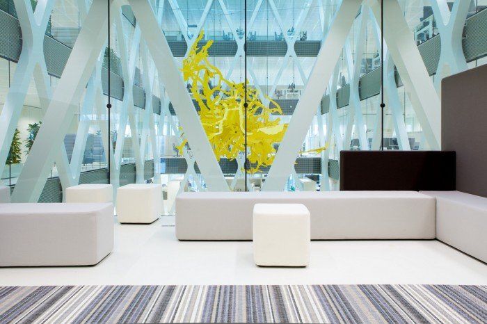 建筑的外立面线条简洁而通透,建筑围绕一个大型的室内中庭而设计,开敞的平面、超高的层高、以及明亮的中庭结构确保室内拥有充足的采光。整体建筑犹如一个纯净通透的玻璃盒子,衬托着精致的家具。#办公室装修公司#