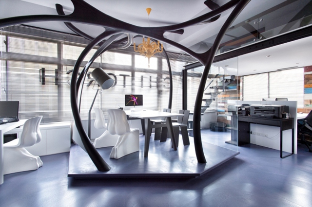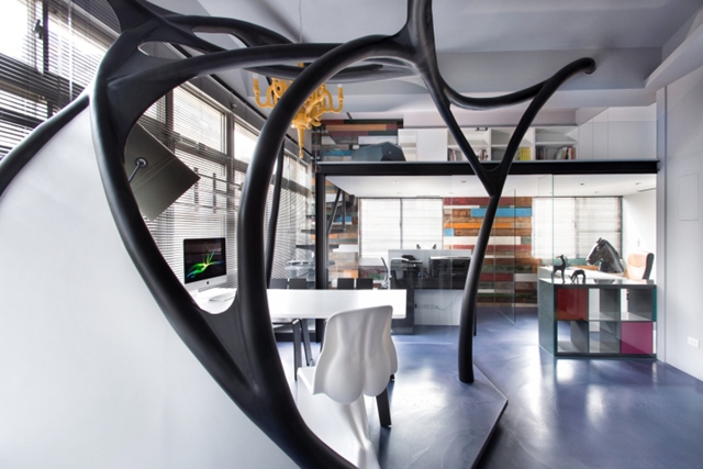 这种张扬的、艺术的、甚至令人咋舌的设计,已经像潜行的新生命在运动,设计师应该多收集有关信息,看到更多新东西,创造未来感。这家公司的办公室整洁、透明,采用了透明玻璃连接无缝混凝土地板,本身办公室的空间并不大,这种做法可以在视觉上扩展面积。这种“大动作”的造型创意,其实可以取一些元素来做为尝试,要知道年轻人往往更爱创意和创新的装修或设计,挑战一切他们认为有意思的东西。
