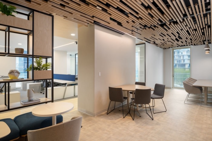 设计团队将办公室厨房重新构想为空间的公共中心,将原本孤立的实用区域转变为公司资产,鼓励轻松、互动的工作场所文化和频繁的协作。厨房和休息室区域具有独特的材料性,例如墨西哥蓝色瓷砖的后挡板和头顶上有节奏的木板条纹理,为办公室会议室中的板条设计增添了动感,感觉就像办公室内的绿洲。#办公室装修设计公司#