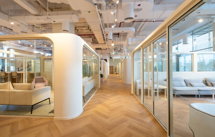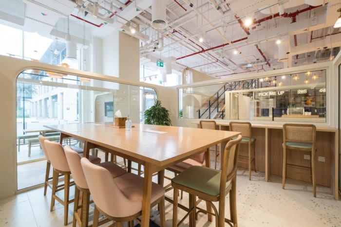 添加室内植物,为室内增添生机和温暖。咖啡厅和电话亭旁边的开放式座位便于与新成员或客人轻松沟通。夹层楼还设有办公室,设有开放式休闲座椅,可俯瞰整个空间。它增加了内部循环的新维度,成为关键元素。材料调色板和柔和的色彩是特意选择的,使该区域更加温馨和舒缓。其中一个有趣的特点是柔和渐变色的玻璃有色隔断,鼓励每个客舱的半隐私。这个概念是创造一个刺激的环境,一个可以产生一种充满活力和互动的文化的环境。#办公室设计装修公司#