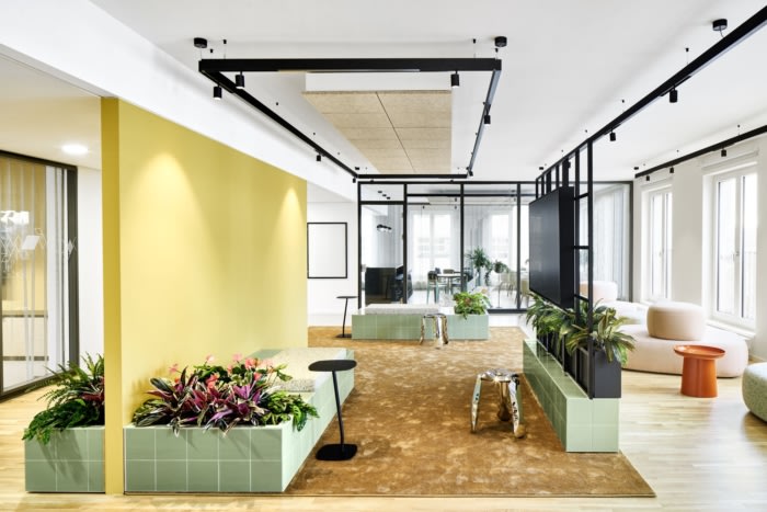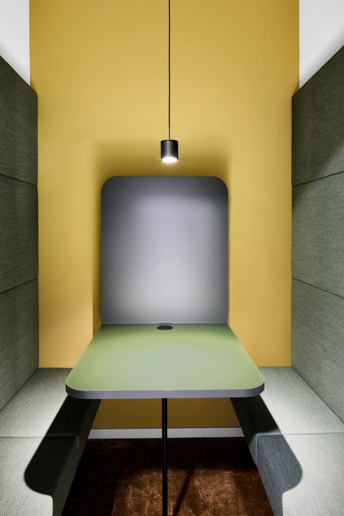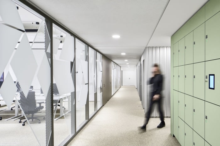 通过非常规的材料使用以及家具和颜色的选择,室内城市对比的多样性变得清晰可见。瓷砖、分隔网格结构和具有声学效果的木丝板在室内以不同的几何结构排列。各种表面、柔软、挺括的织物和地毯与光滑、坚硬的材料(如炻器和固体表面材料)并列。梯形波纹板形状的闪亮反光材料与哑光、粗糙的结构形成鲜明对比。所有材料都具有生态可持续性,易于回收利用。配色方案以自然色调为基础,营造出轻松的办公氛围。#办公室装修设计方案#