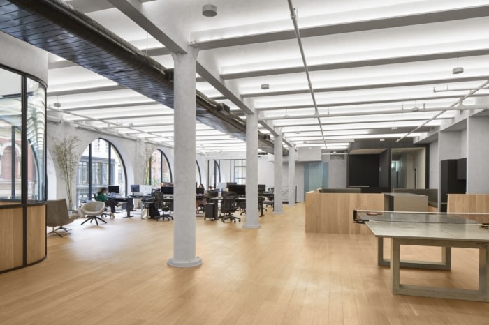 办公室的布局是为了与现有的管道工程一起工作,并且只稍微修改了喷水灭火系统。节能 LED 灯条隐藏在额外的木板上方,将光线从拱形天花板反射回来,间接照亮办公室。拱形窗户经过机械卷帘处理,有助于减轻太阳热量的增加,并在夜间提供隐私。浴室经过重新装修,现有的管道和电气设备仍然存在。现有的楼梯直接将空间与邦德街的私人入口连接起来,并进行了粉刷和重新装修。可持续采伐的工程白橡木被用于地板和木制品。#办公室装修设计#
