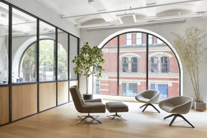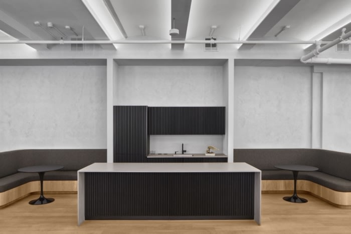 办公室设计的灵感来自日本极简主义和野蛮主义的微妙而俏皮的混合。定制的黑色钢和玻璃办公室隔断的设计类似于日本茶馆的墙壁,橡木地板将它们包裹起来,形成护墙板。接待处和小厨房都覆盖着黑色的手鼓,带有混凝土色调的石英柜台。办公室的墙壁涂有灰色的石灰水洗漆,也类似于混凝土。为了应对拥有如此多坚硬表面的办公空间的声学挑战,安装了一个降噪系统来掩盖相关的混响和回声。最终结果是一个视觉温暖、光线充足、舒适的办公室,激发了创造力和协作。#办公室装修设计公司#