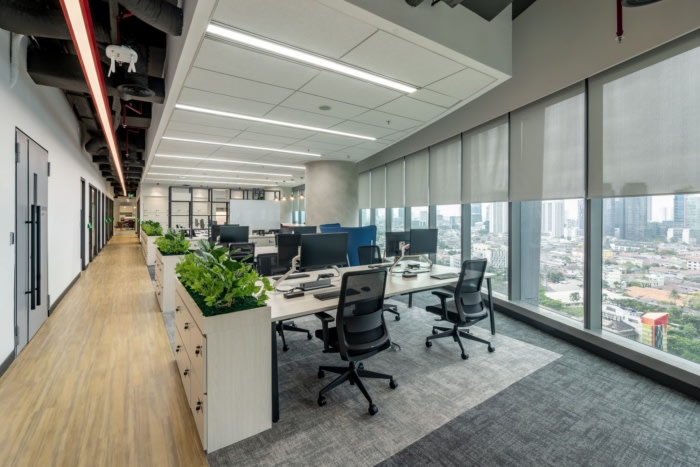 混凝土般的纹理体现了简约,并与木材层压板形成鲜明对比,在接待区和开放式储藏室的综合空间中提供了更温暖、更自然的色调。苔藓墙作为亲自然元素被纳入其中,以提升工作空间的活力,也象征着毅力和长寿。#办公室设计公司#