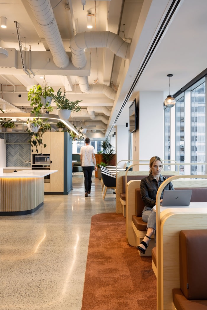 灵感来自自然环境——一个让我们放松和充电的地方。在我们的自然环境中,有一个地方是标志性的海滨别墅,它启发了空间将外部和内部、海滩与山脉联系起来。该楼板专用于大型多用途到达/连接/社交/会议空间。该租约的主入口通过视觉上开放的定制木格子墙和无框玻璃入口门邀请您进入这个西部区域。这确保了为游客提供轻松而诱人的抵达体验,同时仍然遵守 企业的多级安全要求。#时尚办公室装修设计风格#