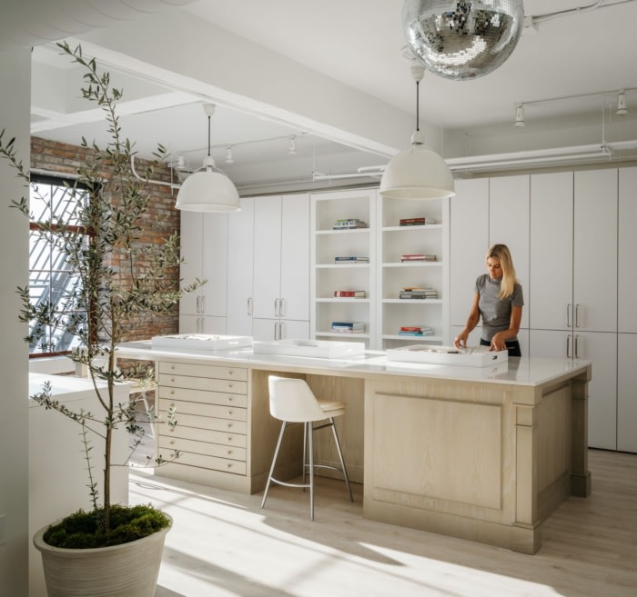 开放式办公室以白色调呈现,支持其和平氛围以及展示艺术、家具和创作过程的能力。长方形空间的尽头是会议室和图书馆,可欣赏到埃利奥特湾和奥林匹克山脉的景色。#办公室设计装修风格#