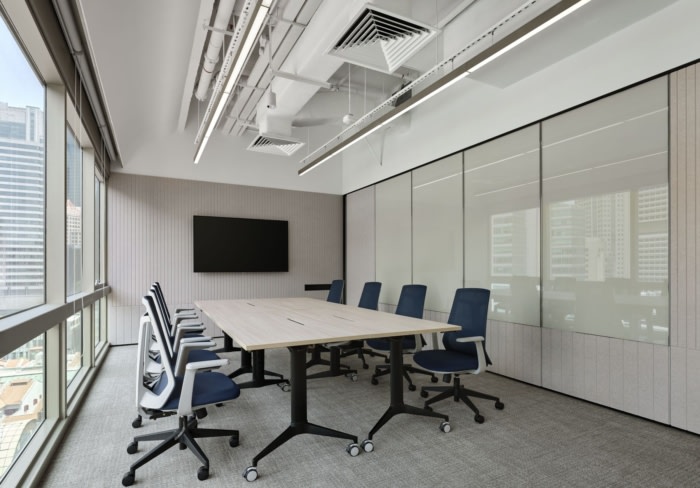 会议室和董事会议室位于主办公空间的中心,从协作工作逐渐过渡到专注工作区域。会议室采用带凹槽的隔音墙板,可提高音质。玻璃面板具有双重用途,既可以让充足的光线从休息区射入,又可以用作白板。靠墙的长凳座位可以举办更大规模的会议。#办公室装修设计#