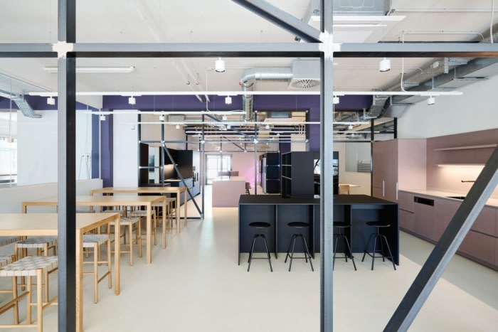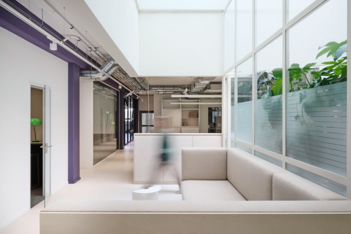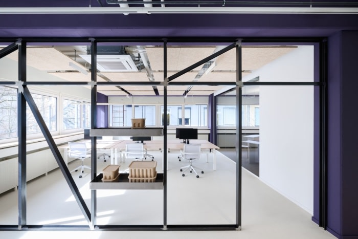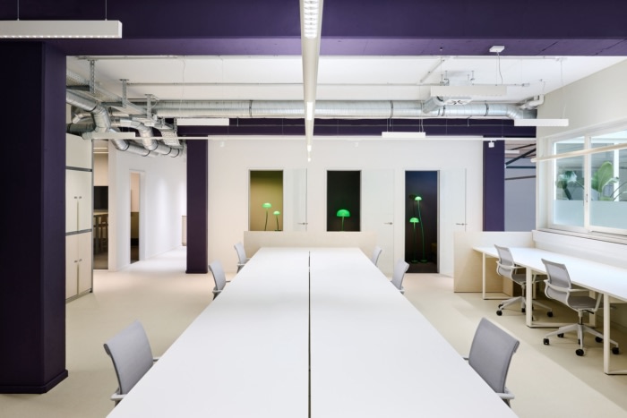 在交流区,会议室和项目室协同作用。会议室是一个创意空间,在这里,创意“绽放”——绿色元素与自然建立联系,象征着植物世界。另一方面,薰衣草色的项目室旨在营造一种平静和鼓舞人心的氛围。柱子上紫色调的使用参考了现有的立面和紫色窗框。灵活的家具布置为创意思维提供了空间。#办公室设计装修公司#