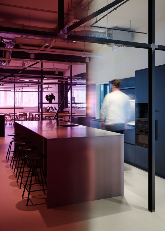 社交区位于一楼。在这里,营造出生机勃勃的氛围,员工们聚在一起交流想法、结交朋友和分享时刻。这个广阔的区域不仅是一个中心交汇点,而且还变成了一个令人难忘的内部和外部活动的舞台。通过其透明区域,可以瞥见车间,它构成了建筑的脉动中心。#办公室设计装修方案#