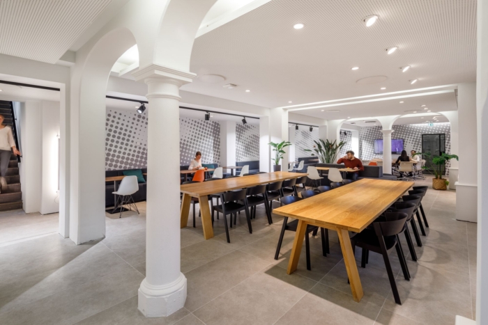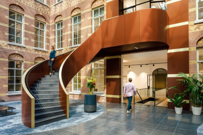 中庭的建筑元素设计松散地参考了新文艺复兴时期的室内立面。通过应用明显的色彩平面,具有原始细节的时代房间被改造成现代办公环境;历史悠久的赭石色调的飞机在装饰华丽的走廊中标记出新的走廊。顶层拥有原始的木椽子,没有隔断,并被组织在不同的“家庭区”中。#总部办公楼设计装修#