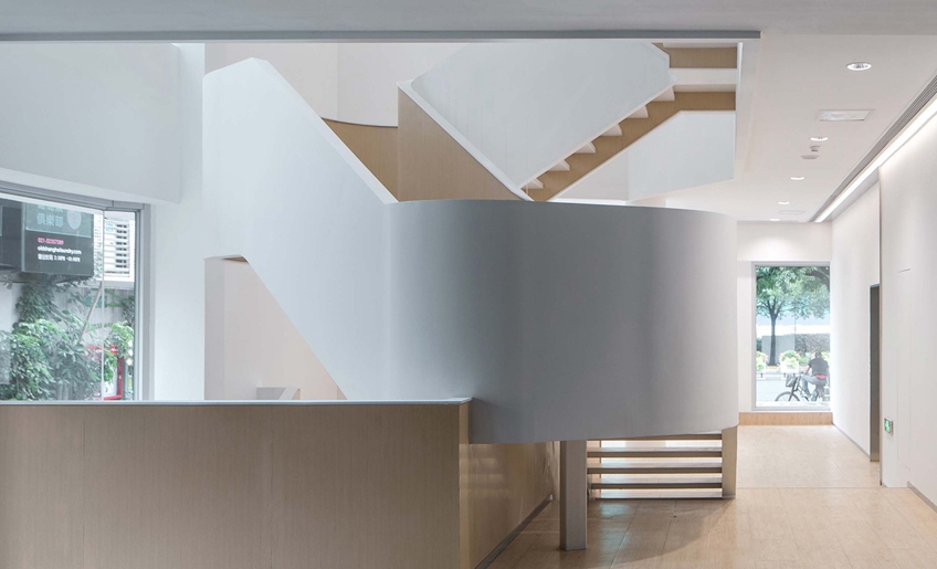 作为一个空间中心,中庭需要一个协调中心。楼梯是作为一个独特的空间装置来发挥作用的。新的舞步从一层到另一层,创造了独特的中庭形象,吸引了更多的人使用中庭,增加了交流的密度。