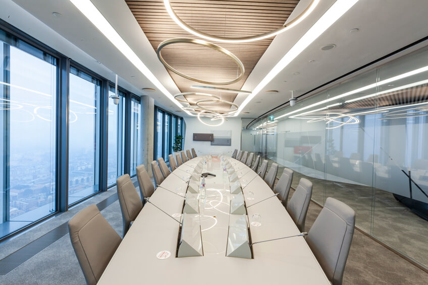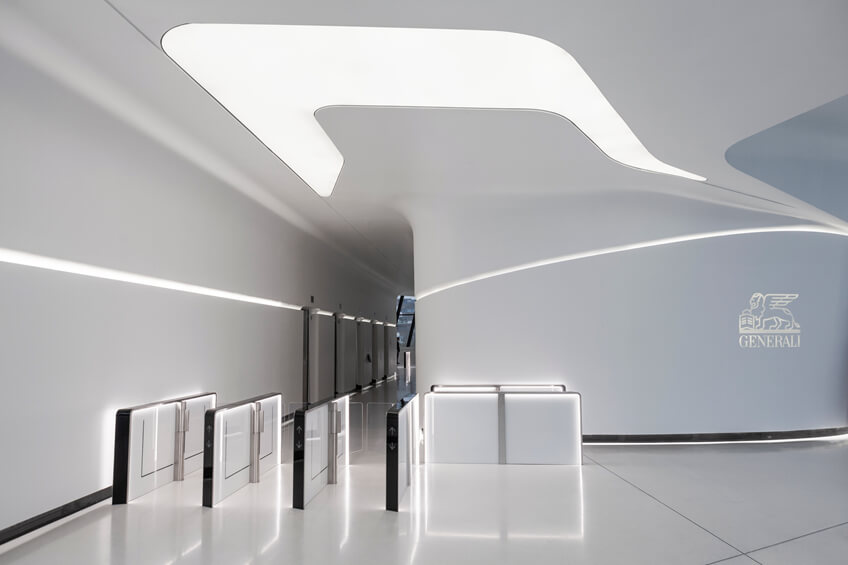 这座高170米、共有44层的建筑与周围公共广场及公园连接在一起,在地面上与城市生活中的三条主要轴线对齐。其办公楼装修设计的曲线几何图形是由这三座城市的轴线在塔底交错相交所产生的向心力所定义的。
