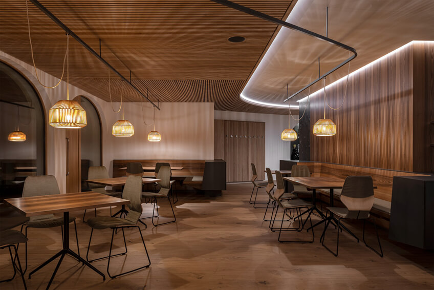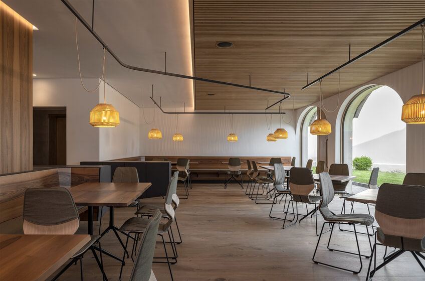 南部地区的深色家具漂浮在木地板上,内部温暖,让人流连忘返。在餐厅区域,灯光点的位置可以通过天花板上的栏杆变化而变化。