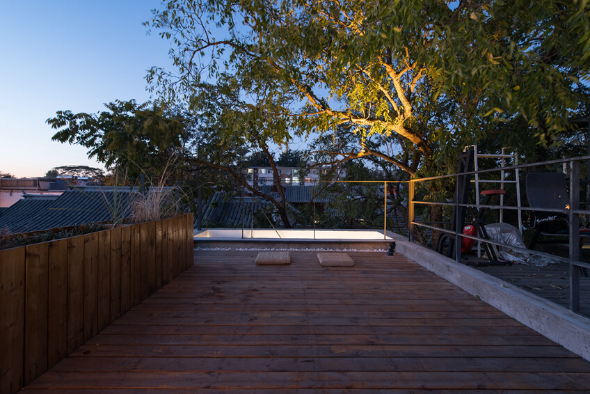 屋顶甲板推进了建筑和枣树之间的对话。该设计的缓冲和低茶几是为了降低身体,包裹在枣树周围,建立一个维度的树下冥想。在西侧,黄昏时分,人们面对西方,透过花草的轮廓,享受着夕阳。